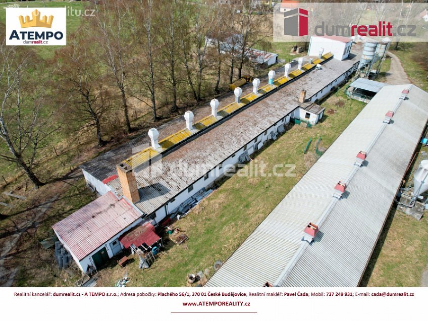 Naše společnost Vám zprostředkuje prodej zemědělského objektu v obci Majdalena, Třeboňsko. Budovy sloužili pro chov prasat se zázemím a stojí na pozemku o celkové výměře 18.720 m² se zastavěnou plochou 2.181 m². Pozemek s objekty leží na strategickém místě ve velmi žádané rekreační lokalitě CHKO Třeboňsko. Celou nemovitost lze využít pro podnikatelský záměr s přípravou výstavby domů k trvalému bydlení dle požadavků CHKO a obce. Po jednání s příslušnými úřady máme tuto variantu připravenu pro další zpracování. Druhou možností podnikatelského záměru je pokračování v zemědělské činnosti. Provozy živočišné výroby jsou technologicky rozděleny na automat řízený PC pro výkrmu a poloautomat pro porodnu a březárnu. V současné době jsou dle územního plánu plochy vedeny jako zastavitelné, s funkčním využitím pro výrobu a skladování zemědělské. Doporučuji osobní prohlídku. Více informací Vám poskytne realitní makléř Pavel Čada z RK A TEMPO s.r.o. fungující pod ochranou známkou naše společnost. Těšíme se na prohlídce. Ev. číslo: 641080.
